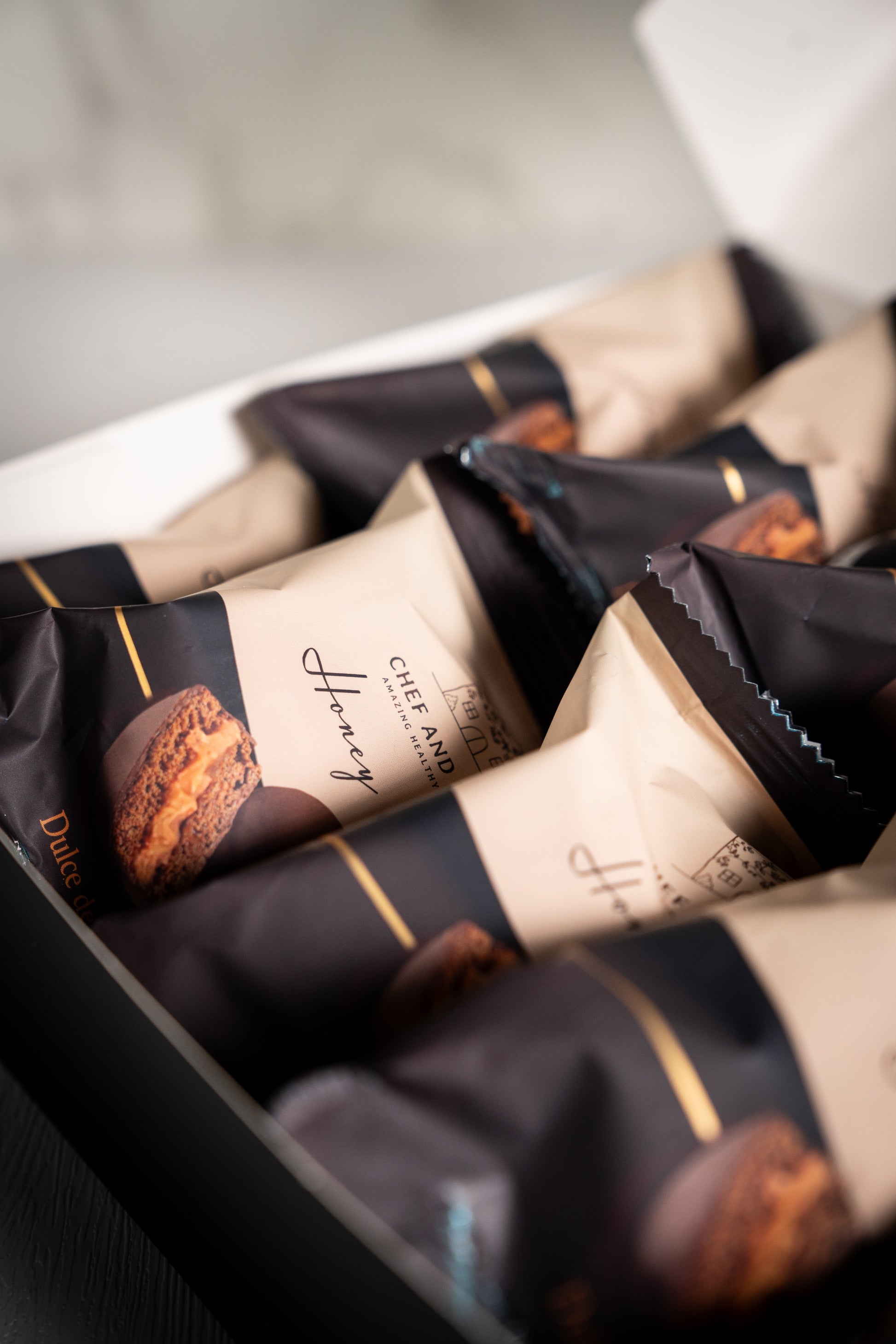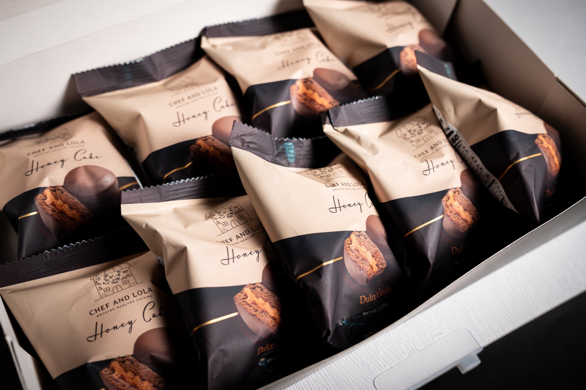A family recipe inspired our creation. The dough of our honey cake is made with almond milk, which gives it an unparalleled softness. It is filled with super creamy dulce de leche with a low sugar content and topped with delicious dark chocolate. This way, we’ve managed to reduce it to just 160 calories per unit.